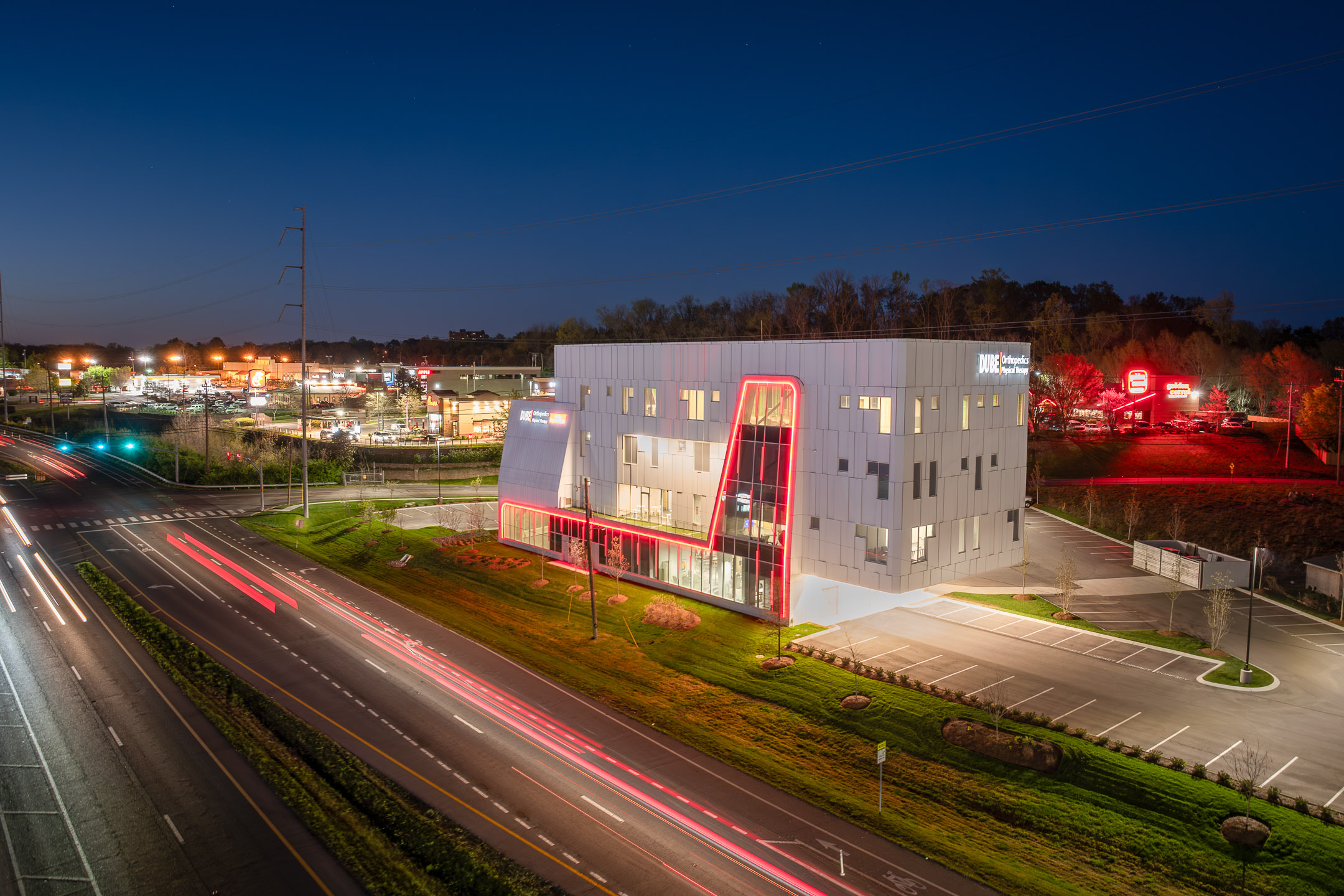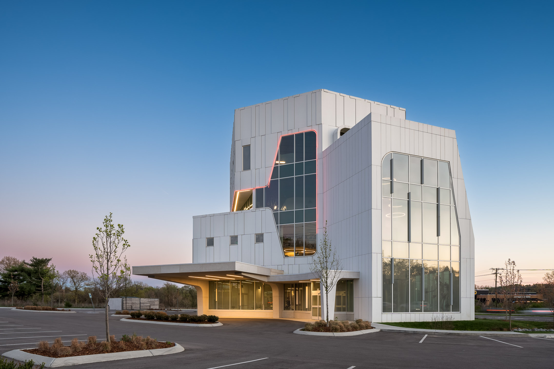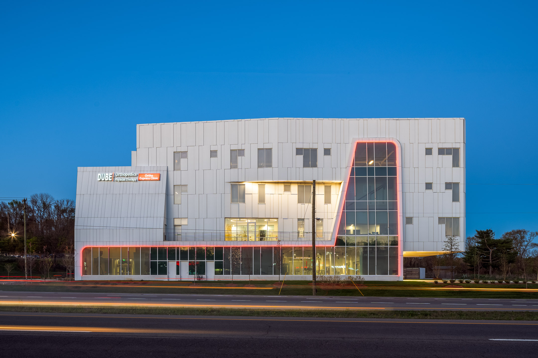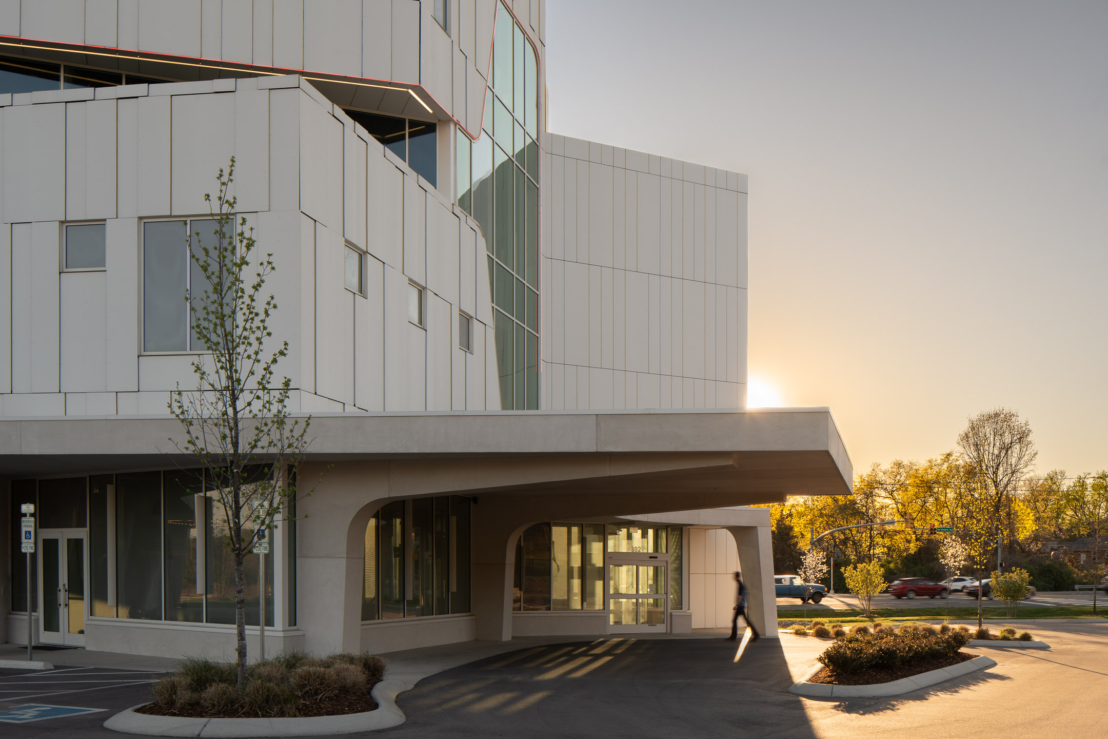 For its new Hermitage building, Dube Orthopedics & Physical Therapy worked with MZA to design a building as dynamic as the human body. MZA devised a sculptural form with its main volume cradled in glass and lifted on slender pilotis. A natural light-filled therapy suite anchors the ground floor, with exam and office spaces on the upper floors. The building is suspended from a hidden truss system, creating shaded terraces and a dramatic profile of its structure A show-stopping porte cochere, a gesture to Eero Saarinen, extends the design's architectural drama outward while welcoming patients in style. Materials were as carefully chosen like the form itself, such as fritted glass which offers privacy, and wavy laminated panels that create a sequin-like façade. The result is an elegantly designed space that is just as much about performance, earning MZA a 2024 AIA Middle Tennessee Honor Award.