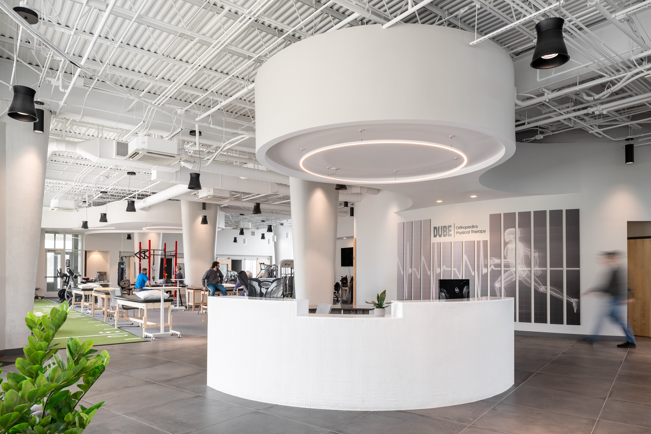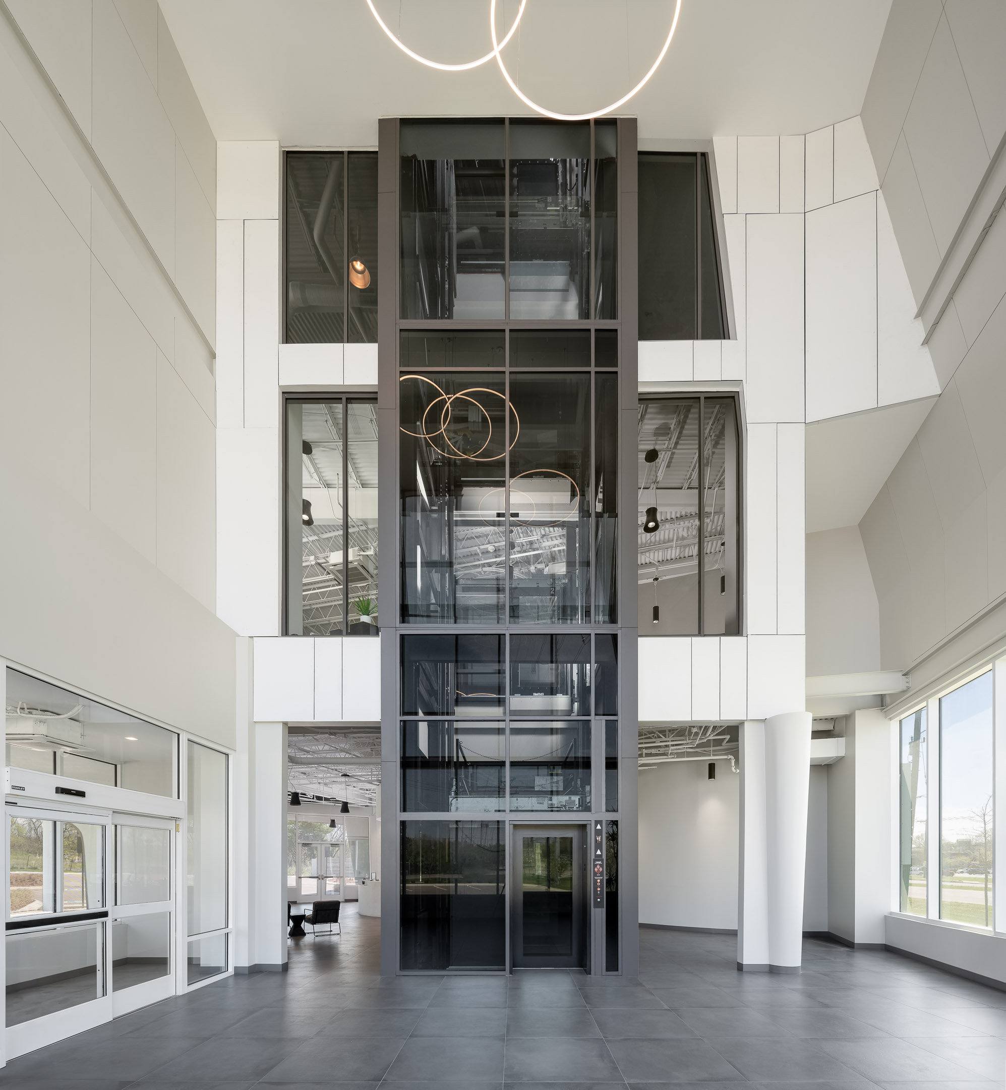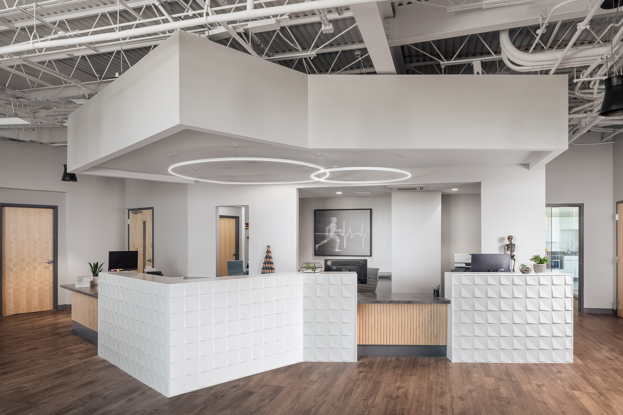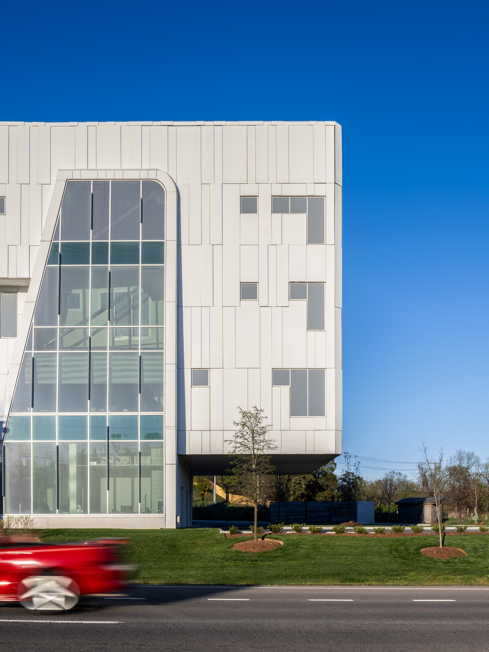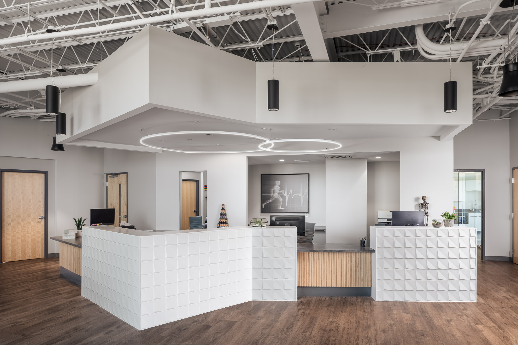 For its new Hermitage building, Dube Orthopedics & Physical Therapy worked with MZA to design a building as dynamic as the human body. MZA devised a sculptural form with its main volume cradled in glass and lifted on slender pilotis. A natural light-filled therapy suite anchors the ground floor, with exam and office spaces on the upper floors. The building is suspended from a hidden truss system, creating shaded terraces and a dramatic profile of its structure A show-stopping porte cochere, a gesture to Eero Saarinen, extends the design's architectural drama outward while welcoming patients in style. Materials were as carefully chosen like the form itself, such as fritted glass which offers privacy, and wavy laminated panels that create a sequin-like façade. The result is an elegantly designed space that is just as much about performance, earning MZA a 2024 AIA Middle Tennessee Honor Award.
