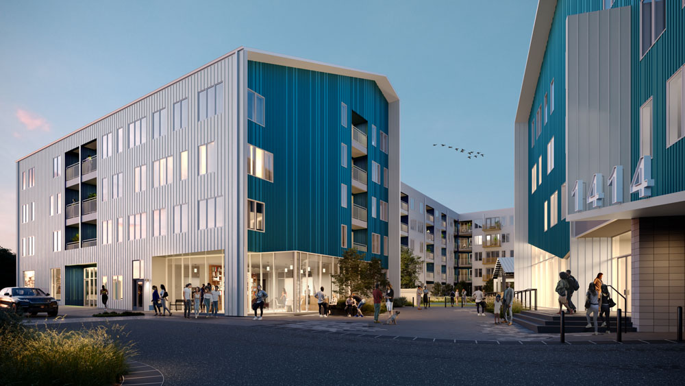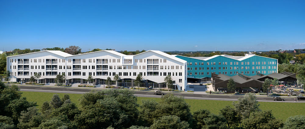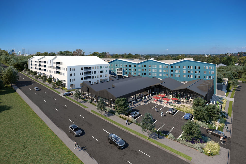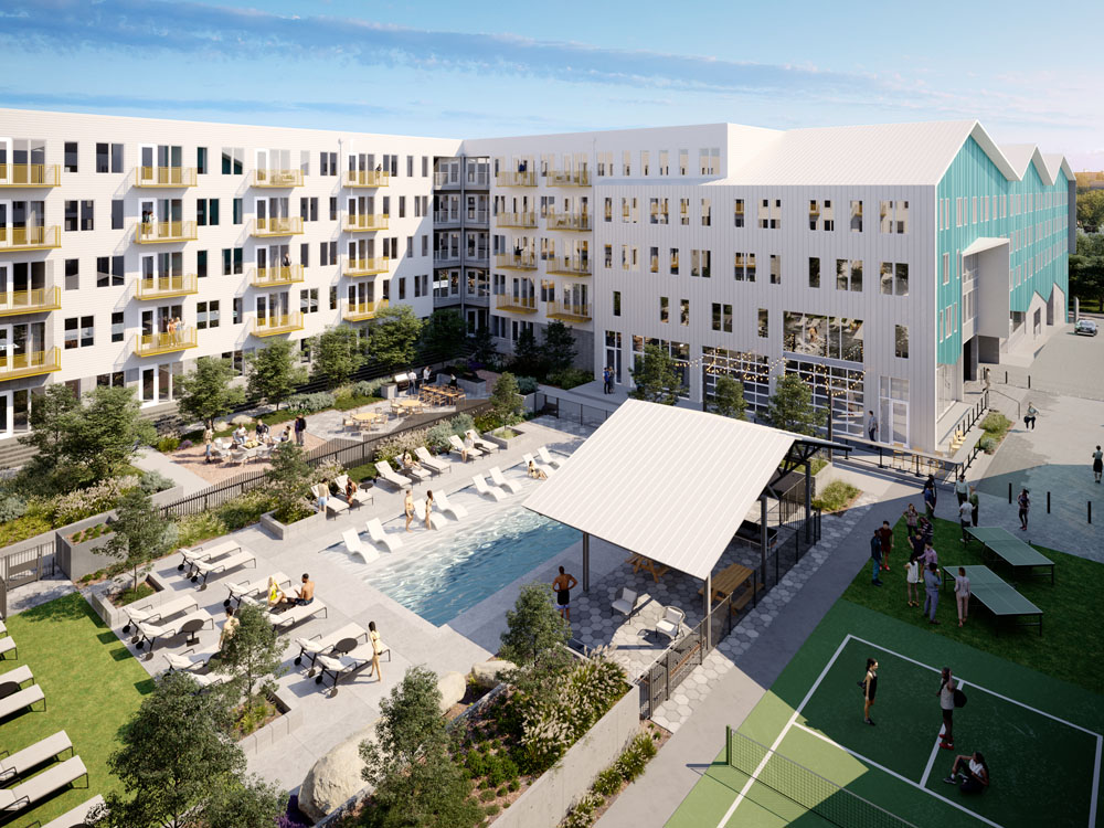 Emblem Park redevelops a former warehouse property in Nashville's Wedgewood-Houston neighborhood into a lively mixed-use community. The 5-acre site, developed by Somera Road and designed in collaboration with EOA, now boasts 346 apartments, 20,000 SF of retail, and amenity-rich interiors. MZA looked to the property's industrial past for inspiration, referencing corrugated metal skin, pitched rooflines, and pops of teal to create a distinctive identity. A restrained palette indoors creates a backdrop for splashes of vibrant artwork and sculptural furniture, including a custom wallcovering by local designers New Hat. The biggest challenge was preserving the character of the original warehouse while bringing new life to the space. By retaining a portion of the existing structure, Emblem Park offers adaptive reuse retail and amenity spaces that anchor the community. The result is a contemporary, textured development that is both rooted and futuristic.