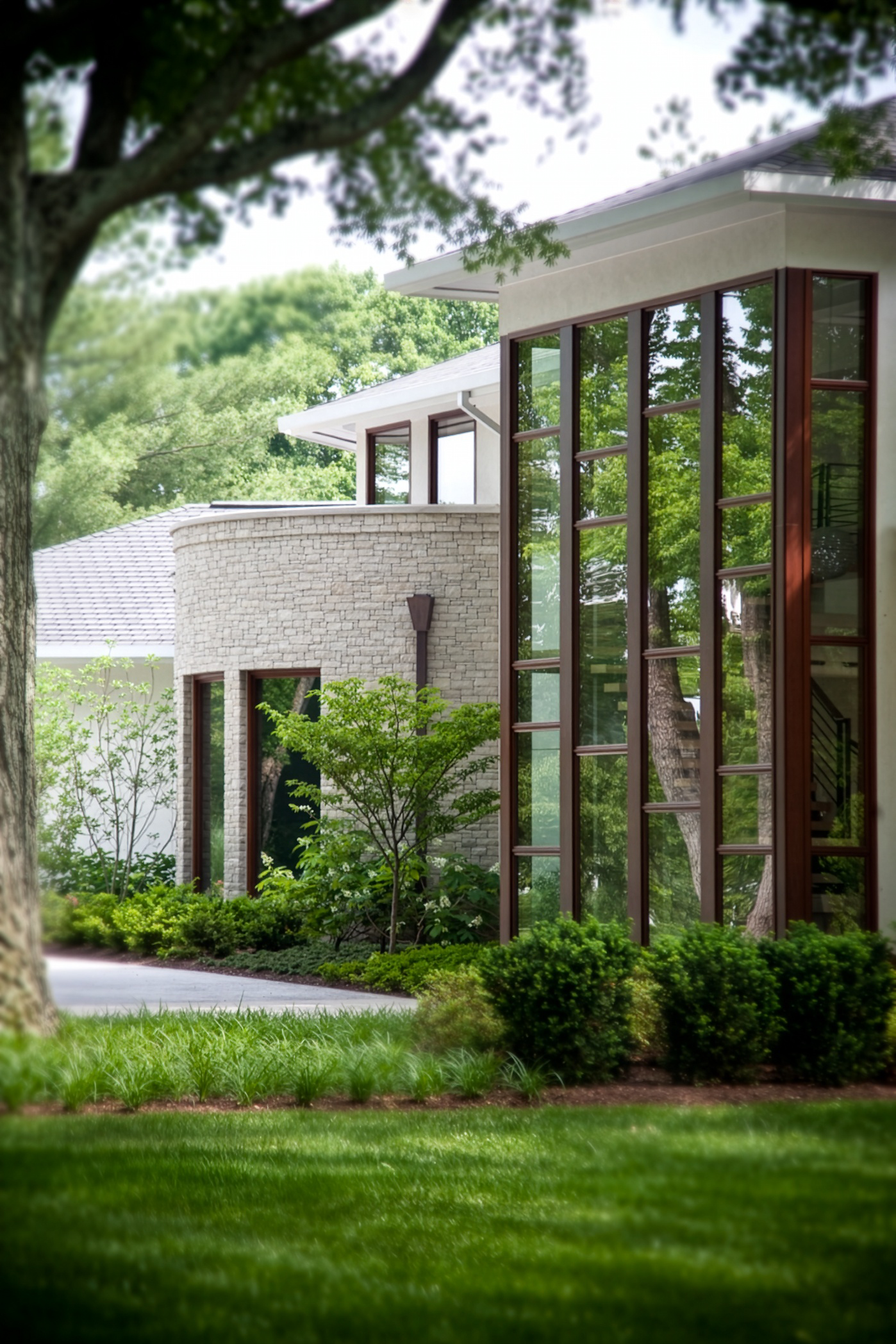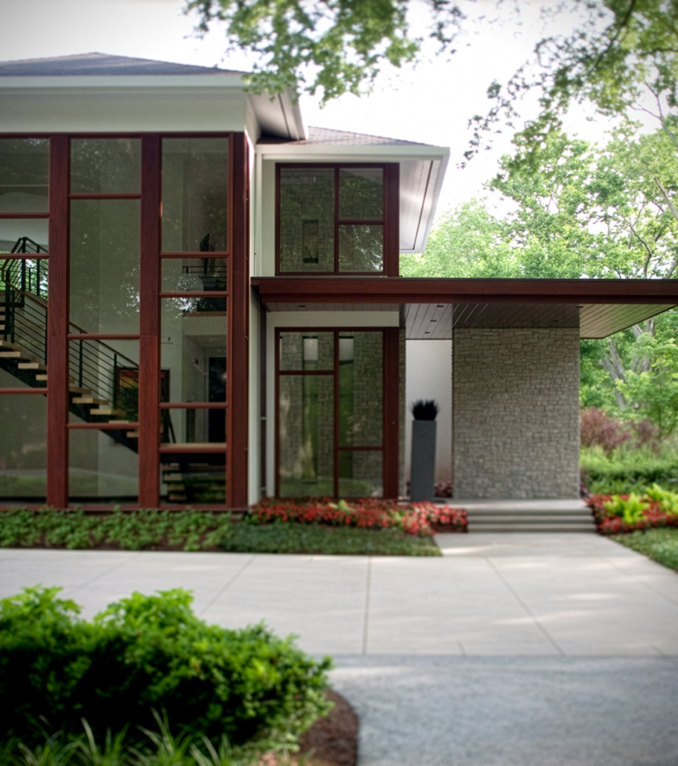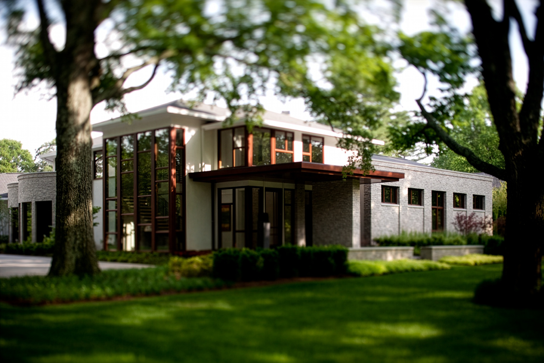 MZA designed the Eskind Residence, an 8,000-square-foot modern home on a high-profile corner in Nashville's Belle Meade neighborhood. The client desired a home that was equally about privacy and openness, a retreat that remained highly accessible to the outdoors. The home winds around an interior pool and garden, large window walls engulfing the environmentally conscious landscape and dissolving the boundary between interior and exterior space. Going to the street side, mahogany windows and stone walls convey a warm, understated sophistication. The rear elevation is the minimalist equivalent with white stucco and aluminum storefront windows. MZA's design produces two faces, public and private, but maintains a single architectural identity. This light-filled, peaceful home is at once earthy yet expansive, giving its owners everyday access to nature without sacrificing comfort or style.