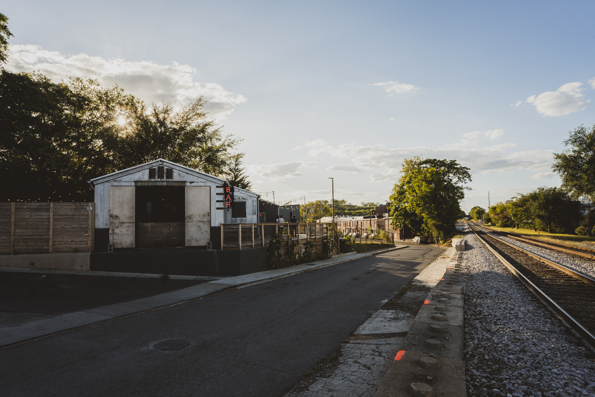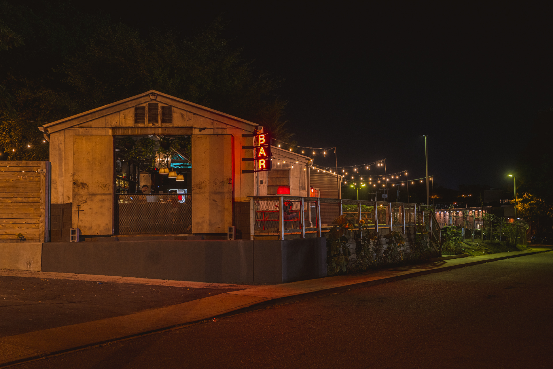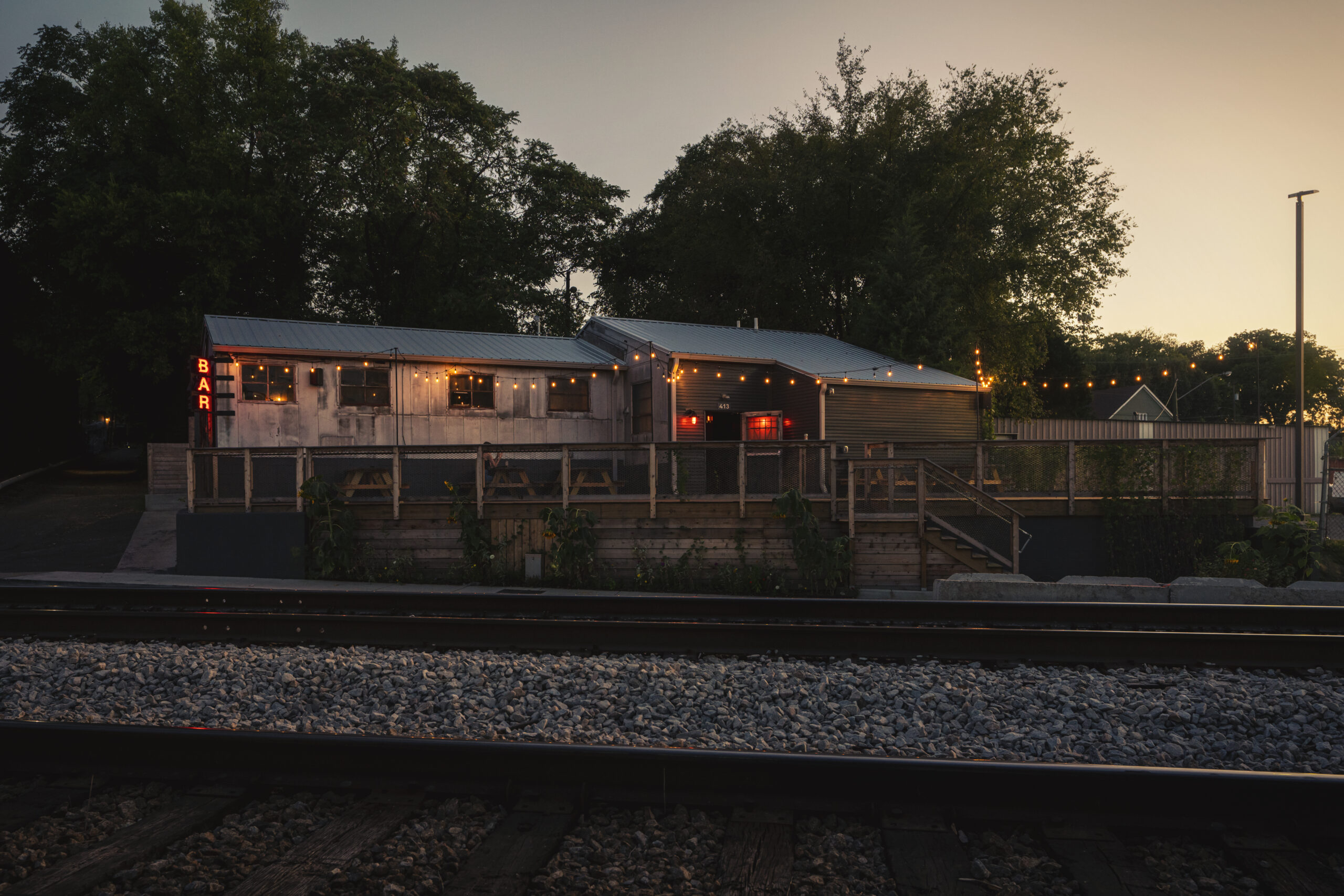 Jamie and Bryan Kenney envisioned converting a gritty, old welding shop in Nashville's offbeat Wedgewood-Houston district into Never Never, a cozy bar and restaurant free of the constraints of time. MZA appreciated the building's industrial nature, opting to preserve original features like the massive doors that once accepted massive equipment. To overcome challenging site slopes, MZA constructed a raised front patio, with dramatic entries and picturesque vistas over neighboring railroad tracks. Attractive wood patios now soften the initial metal and concrete exterior, providing cozy, inviting areas. Never Never offers a singular, timeless experience, with locals appreciating a perfect escape from the stresses of daily life.