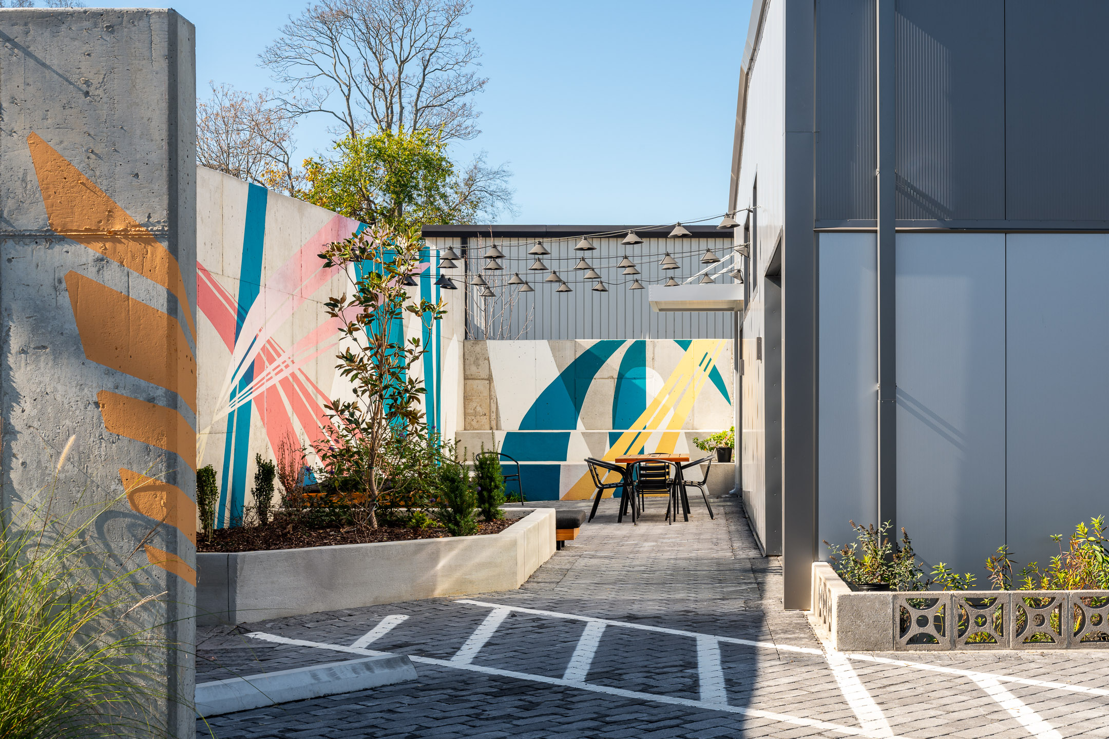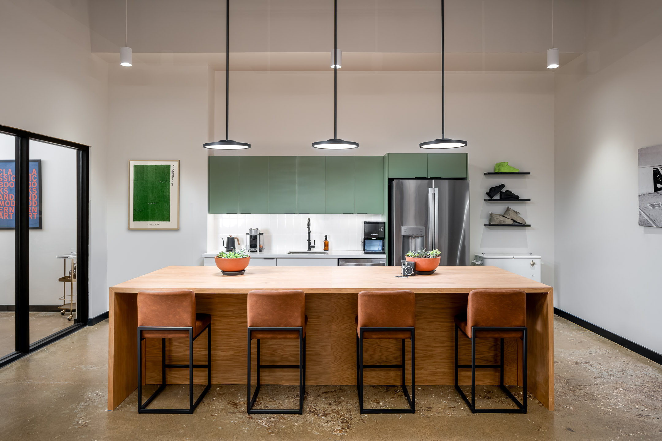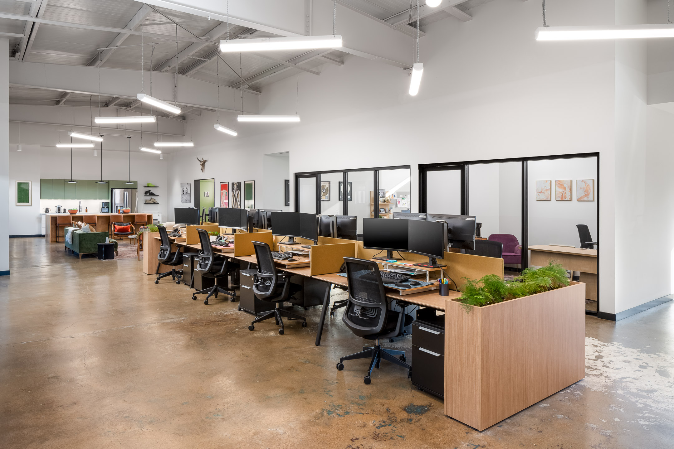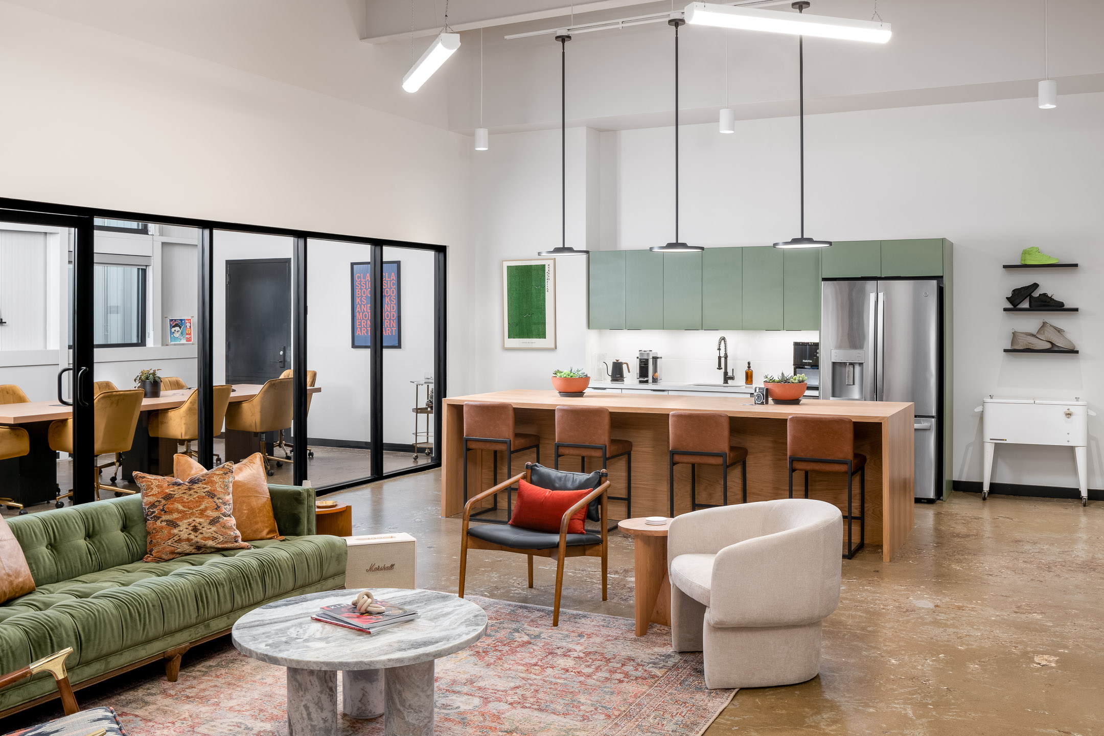 PSBM, a management firm that serves creatives, asked MZA to convert an 8,000-square-foot Nashville warehouse into a headquarters that is both professional and personality-filled. MZA left the original steel skeleton of the building in place and updated the envelope with energy-efficient panels, preserving its industrial aesthetic. PSBM's offices occupy the top floor, where glass partitions offer acoustic separation without losing daylight. Exposed concrete and metal textures are juxtaposed with fresh new smooth finishes to create a refined but rugged appearance. An outdoor patio is surrounded by a mural, done by Adrien Saporiti, and allows room for team meetings and creative refueling. A white-box tenant space and future expansion suite are also housed in the building, giving PSBM some breathing room. The result is a smart, responsive workplace that captures the diverse energy of clients they serve.